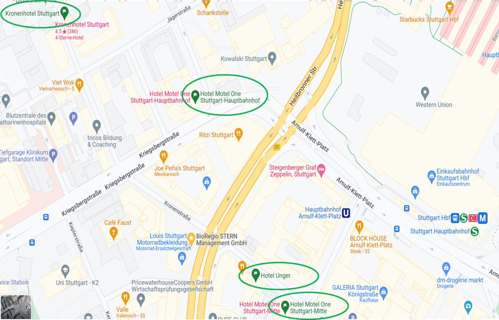 We recommend the following hotels in the immediate vicinity of the venue Haus der Wirtschaft Baden-WĂĽrttemberg (Willi-Bleicher-StraĂźe 19, 70174 Stuttgart):